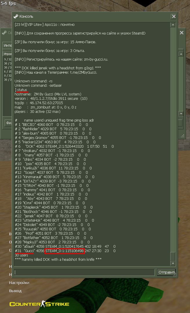 Если команда «status» недоступна, можно зайти на другой сервер и прописать её уже там, либо узнать свой Steam ID у главного администратора сервера.